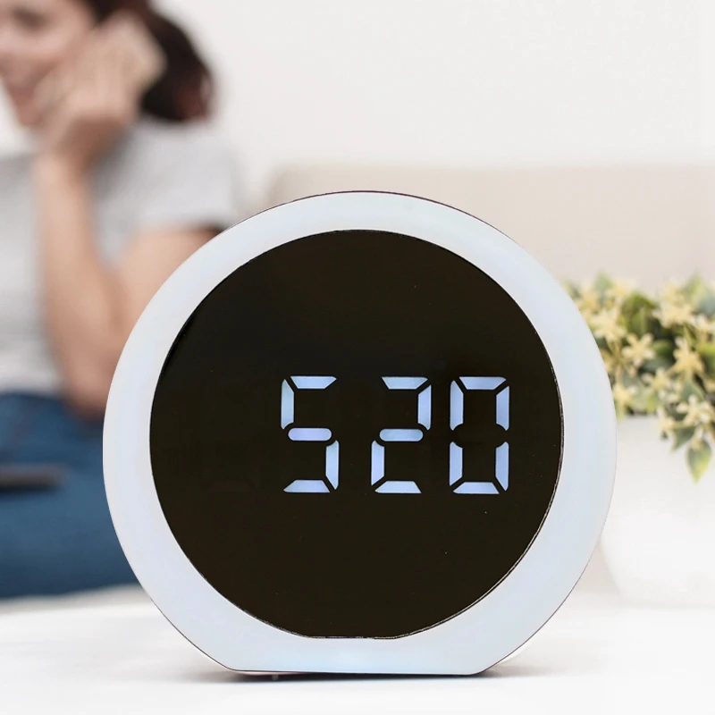 Modern Decor Round Makeup Mirror Lighted Large Display Easy Setting Auto Dimming USB Port Digital Alarm Clock for Office Gift