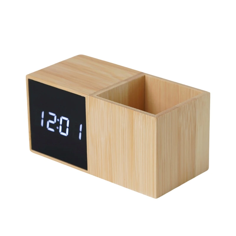 Promotional Wholesale Bamboo Casing Calendar Alarms Temperature LED Time Display Digital Alarm Clock With Organizer